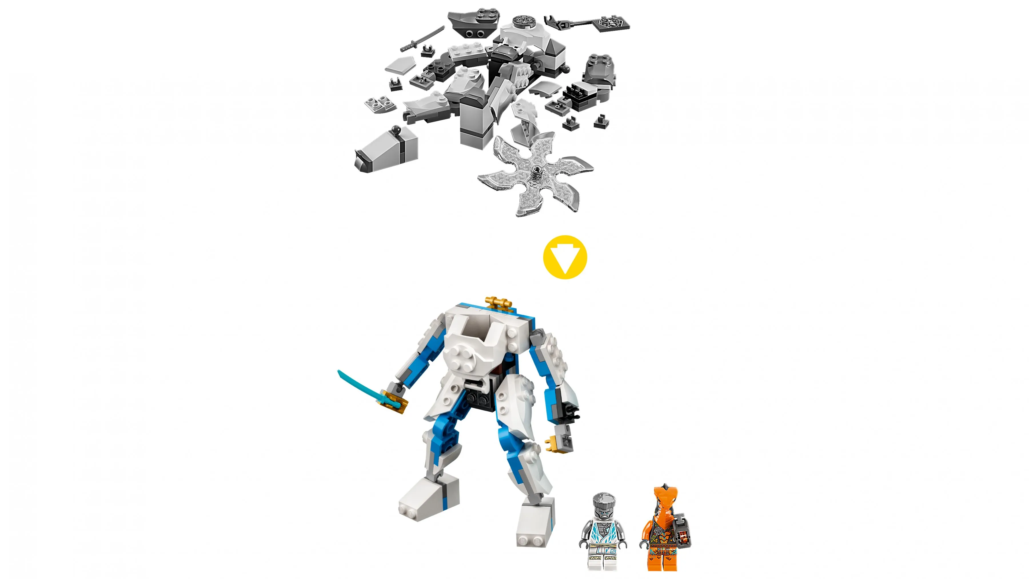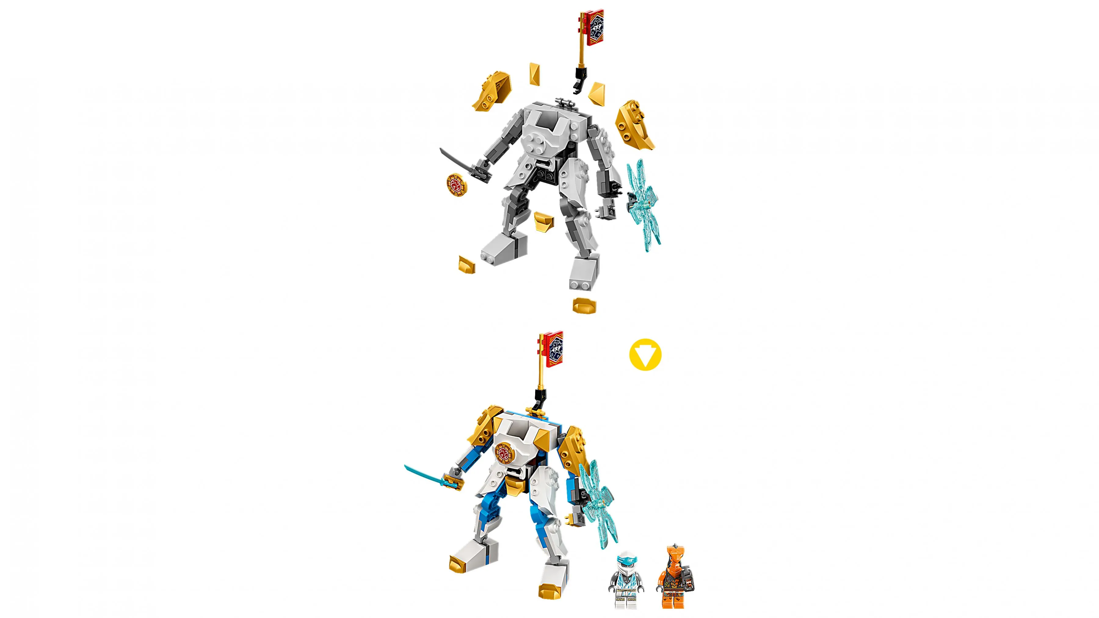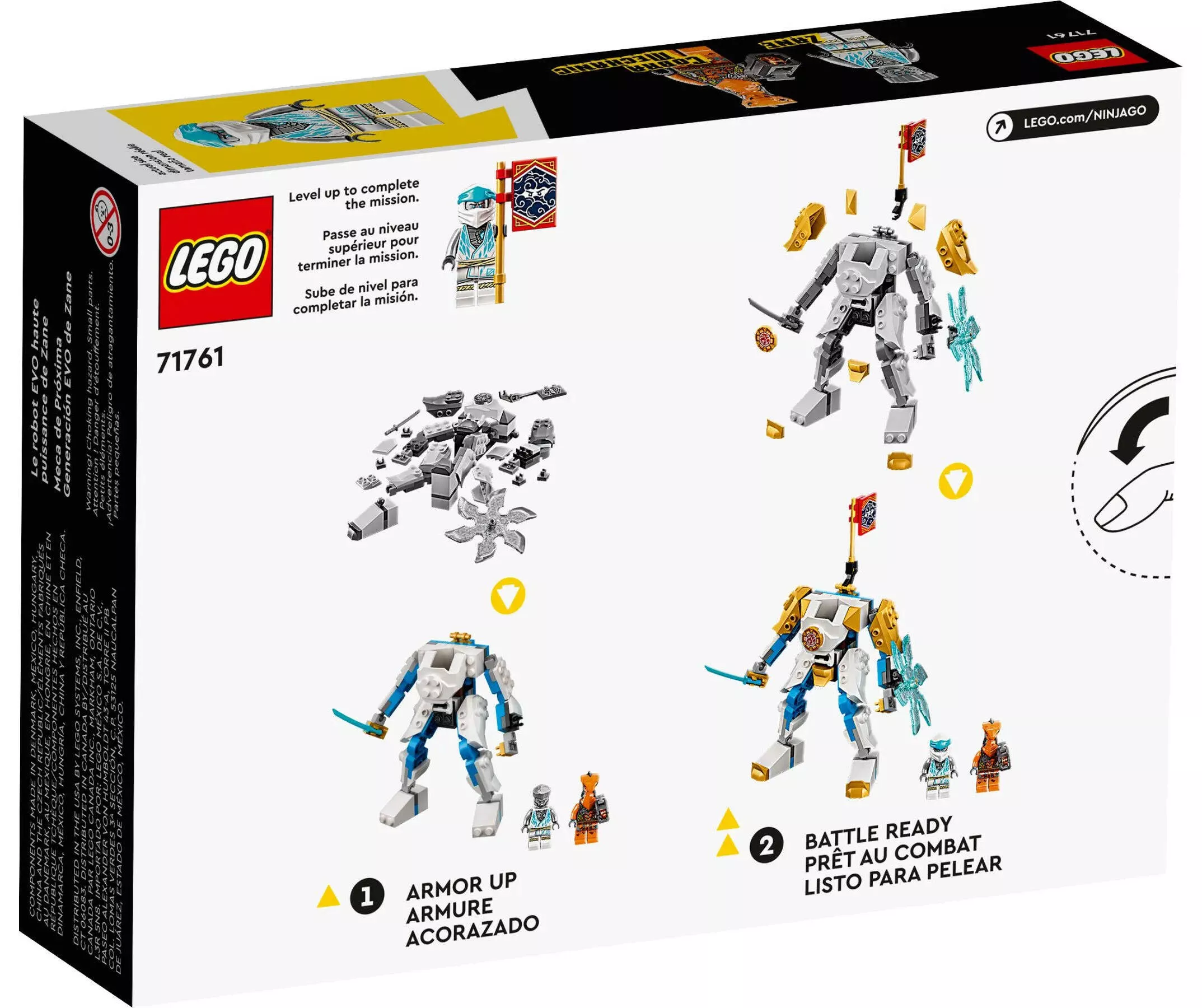 Этот набор предлагает собрать мощного робота ЭВО Зейна, который отличается высокой маневренностью и прочностью. В комплекте идет минифигурка Зейна, который вооружен катаной и готов к борьбе с любыми угрозами. Робот оснащен подвижными конечностями, что позволяет придавать ему различные боевые позы, а также имеет кабину, в которой Зейн может управлять своим механическим телом.