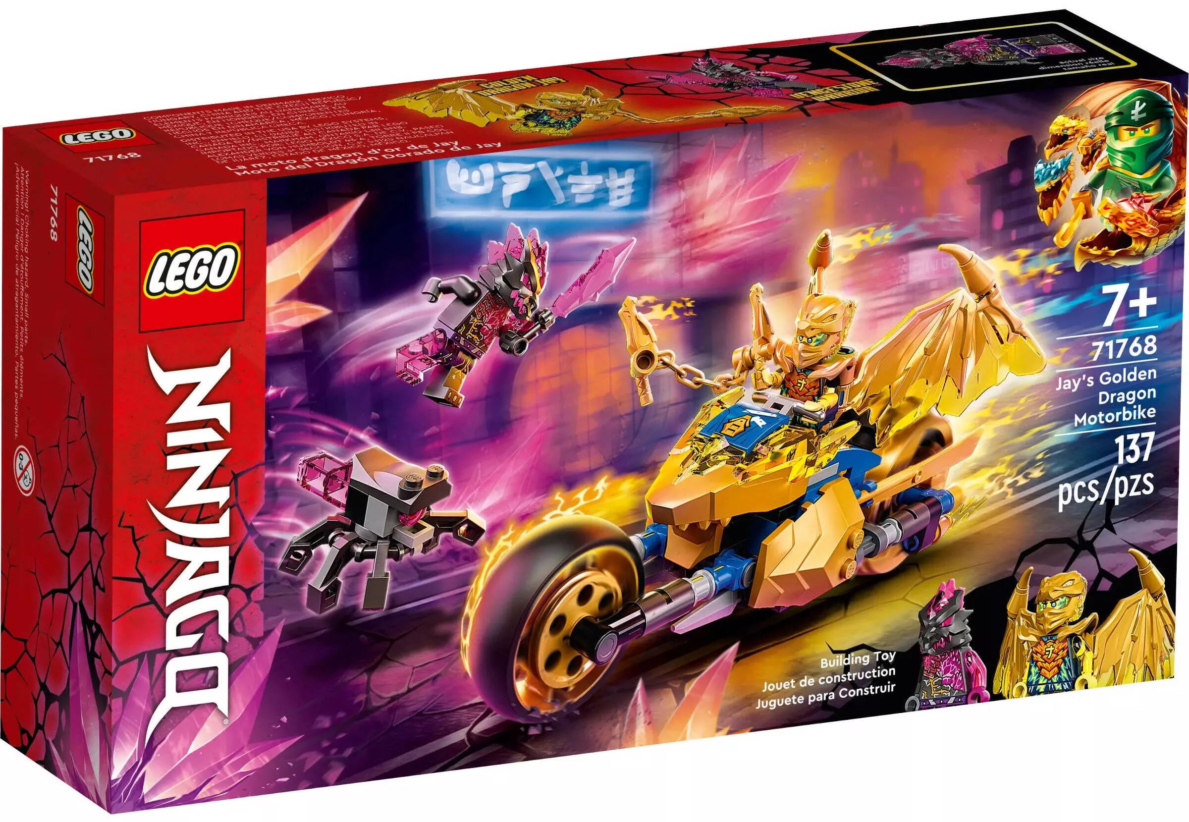 Набор состоит из 137 деталей и идеально подходит для детей от 7 лет. LEGO Ninjago 71768 Мотоцикл Джея Золотой дракон позволит детям погружаться в мир захватывающих приключений ниндзя, сражаясь против злодеев и защищая мир Ninjago. Этот набор станет отличным дополнением к коллекции LEGO Ninjago и подарит массу возможностей для творчества и фантазии, позволяя создавать собственные боевые сцены и истории.