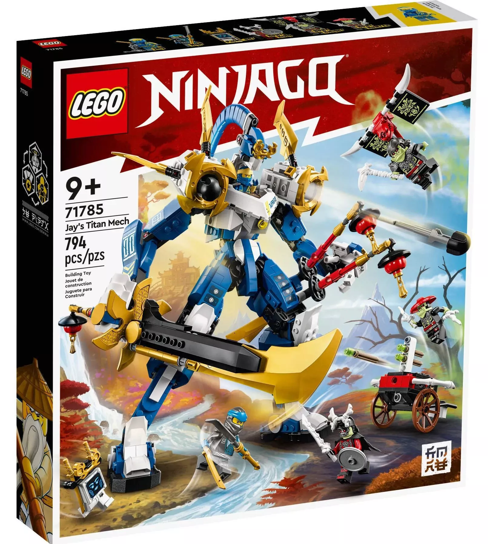 В наборе LEGO Ninjago 71785 Робот Джея Титан содержится 794 детали, с помощью которых можно собрать впечатляющего робота с подвижными элементами и разнообразным оружием. Робот выполнен в синих и золотых цветах, соответствующих молниеносной силе Джея. Его дизайн впечатляет детализацией: большие ноги для устойчивости, мощные руки с боевыми клинками и вращающийся торс, что позволяет ему принимать боевые позы и быть готовым к любому сражению.