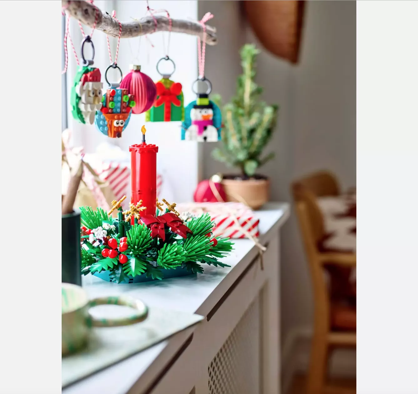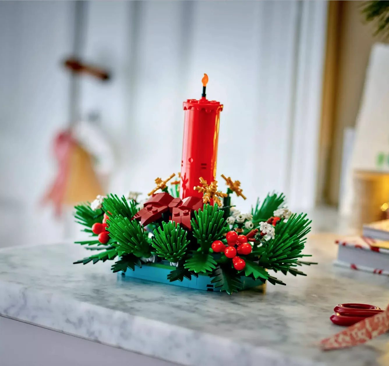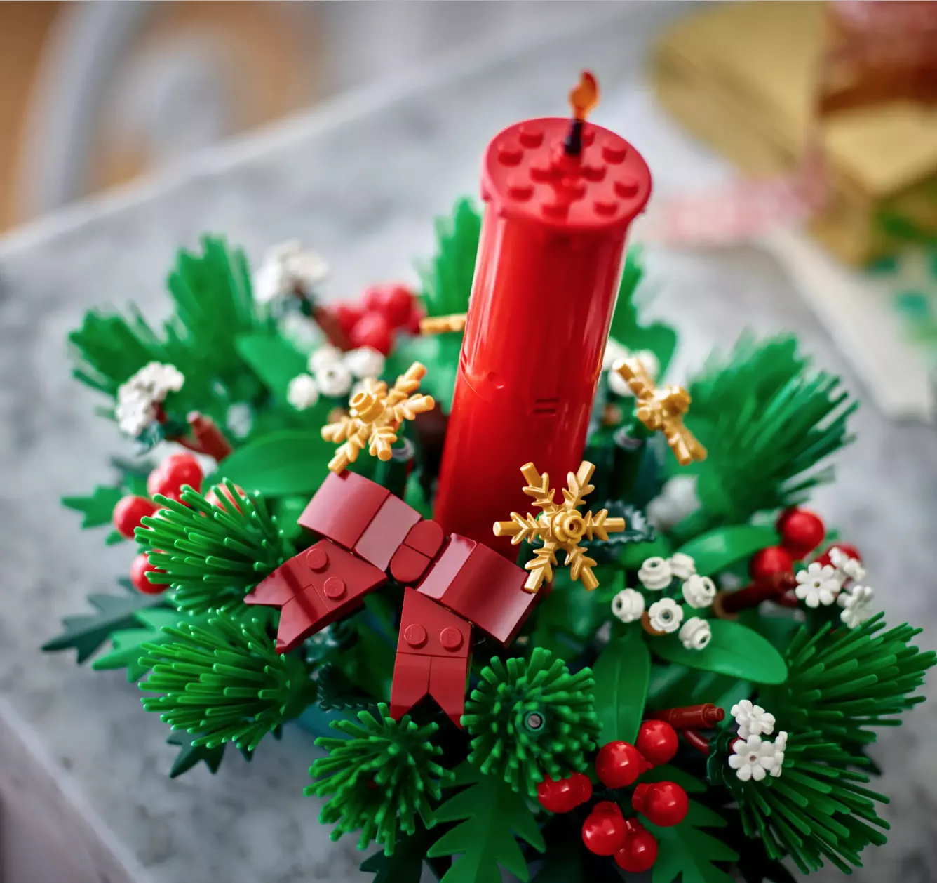 • Праздничная радость – в центре рождественского набора LEGO красная свеча, окруженная красными ягодами, золотыми звездами и зеленой листвой.
