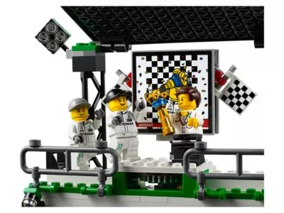 Stelle dein Können als Fahrer, Renningenieur, Teammanager und sogar als Fernsehkameramann auf die Probe – mit dem actiongeladenen LEGO Speed Champions Set MERCEDES AMG PETRONAS Formula One Team. Benutze den Wagenheber in der Werkstatt, um die Rennwagen vom Typ Mercedes F1 W07 Hybrid auf das Rennen vorzubereiten. Setz dich ins Cockpit und tritt an der Startlinie gleich voll aufs Gaspedal. Die Leistung der Autos kannst du am Monitor in der Boxengasse überwachen. Verstelle den Kameraarm, um die spannende Renn-Action aus der Vogelperspektive zu erfassen. Wenn das Rennen vorbei ist, drehst du den großen Bildschirm in der Tribüne um und bringst so das Siegerpodest zum Vorschein. Stemme den Siegerpokal in die Höhe ... und geh dann zum Hotdogstand, um dir einen wohlverdienten Imbiss zu holen!