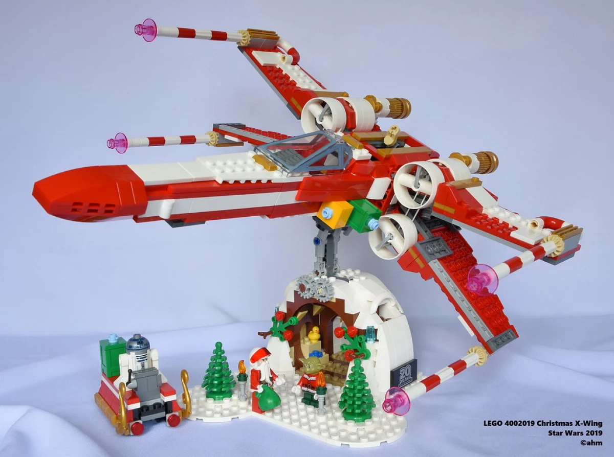 В наборе LEGO Star Wars 4002019 Christmas X-Wing представлена уникальная версия знаменитого истребителя X-Wing, украшенного в рождественском стиле. Основной корпус и крылья корабля выполнены в традиционных красных, белых и зеленых цветах, соответствующих рождественской тематике. В комплект входят также праздничные аксессуары, которые подчеркивают зимнюю тематику набора: миниатюрные рождественские венки, подарки и даже Санта-шапочка для пилота.