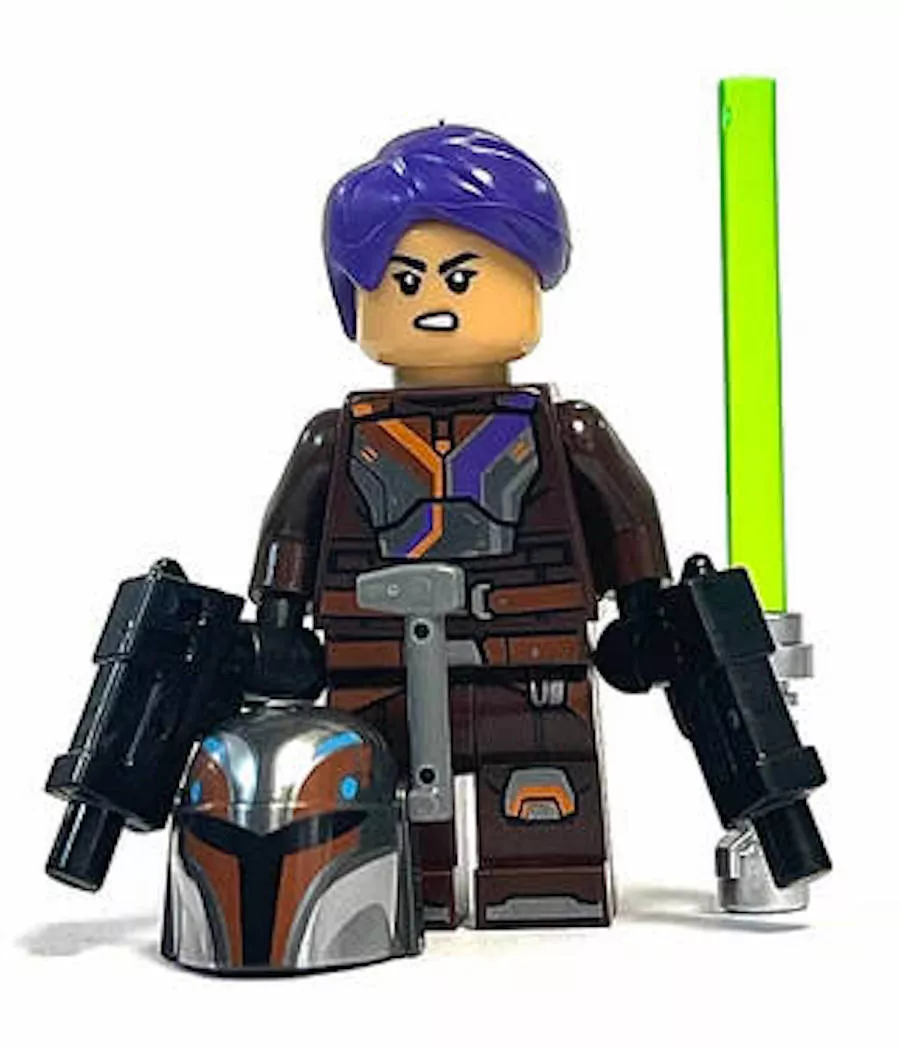 sw1302 Сабина Рен в темно-коричневой броне. Эта версия минифигурки Сабины Рен является эксклюзивной для набора LEGO «Шаттл джедая Т-6 Асоки Тано». Минифигурка Сабины Рен LEGO Star Wars впервые была представлена в 2023 году в наборе 75362 «Шаттл джедая Т-6 Асоки Тано»