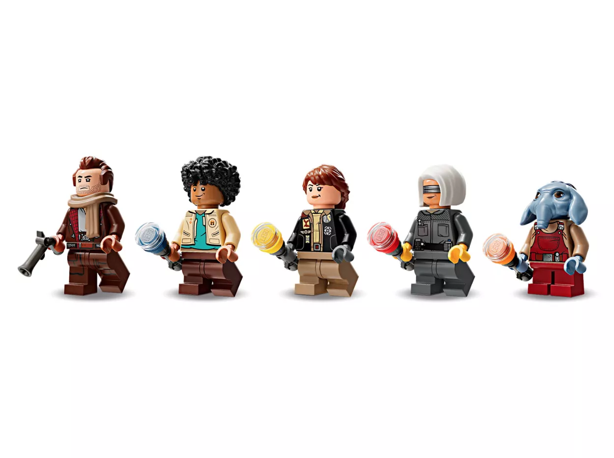 • 5 персонажей LEGO Star Wars: минифигурка Джода с бластером в винтажном стиле, а также минифигурки Вима, Кей Би, Ферна и Нила, каждая из которых оснащена сборным аксессуаром в виде факела.
