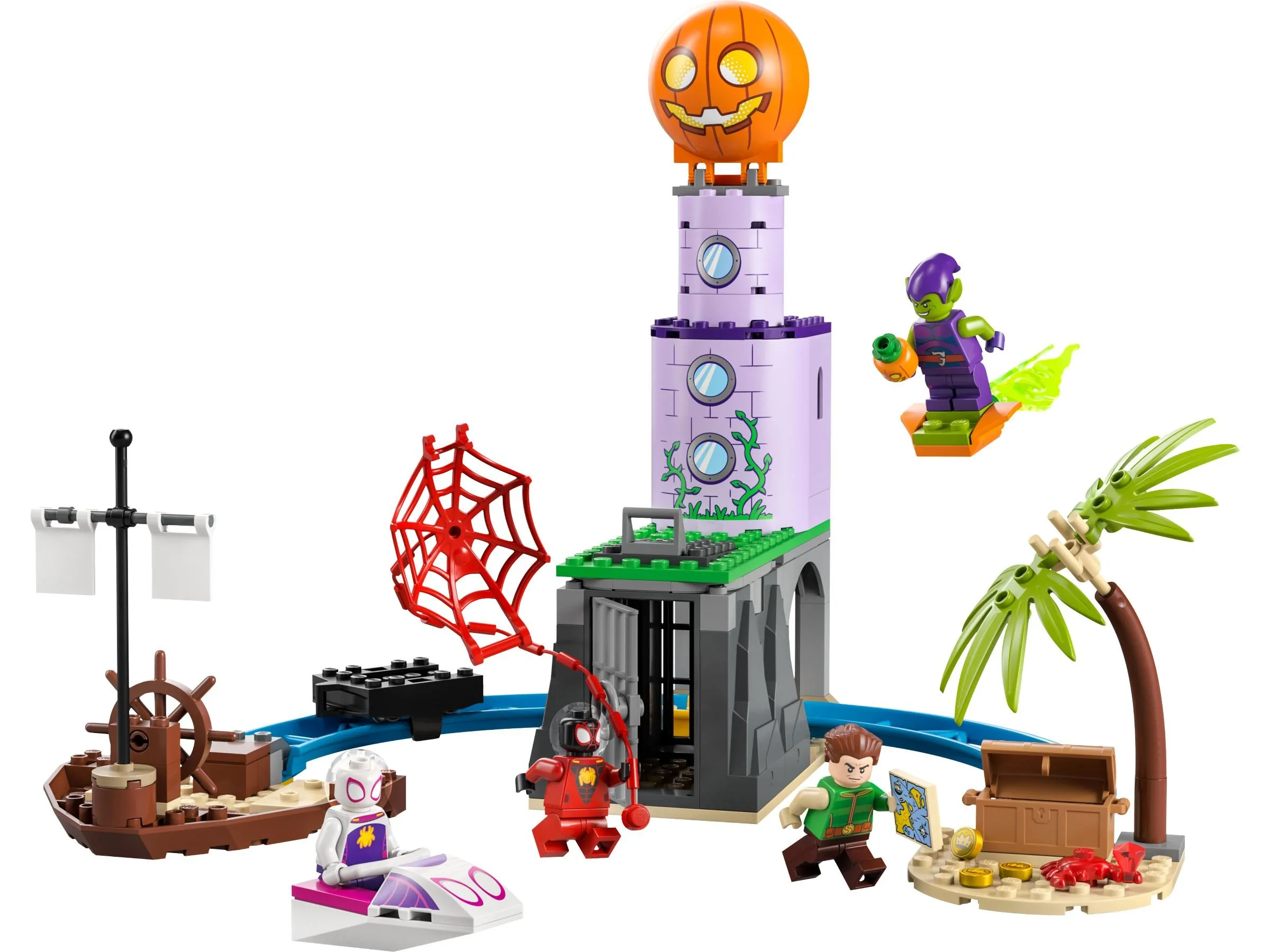 В наборе Команда Пауков на Маяке Зеленого Гоблина представлены три минифигурки – Человек-паук, Призрачный Паук (Гвен Стейси) и Зелёный Гоблин, каждый из которых имеет свои уникальные способности и аксессуары. Главным элементом набора является маяк с множеством игровых функций, включая секретное убежище Зеленого Гоблина, паутины для захвата и ловушек, а также различное оборудование для сражений. Дополнительные аксессуары включают в себя транспортные средства, такие как глайдер Зеленого Гоблина и водный скутер Призрачного Паука, что добавляет динамики и разнообразия в игру.