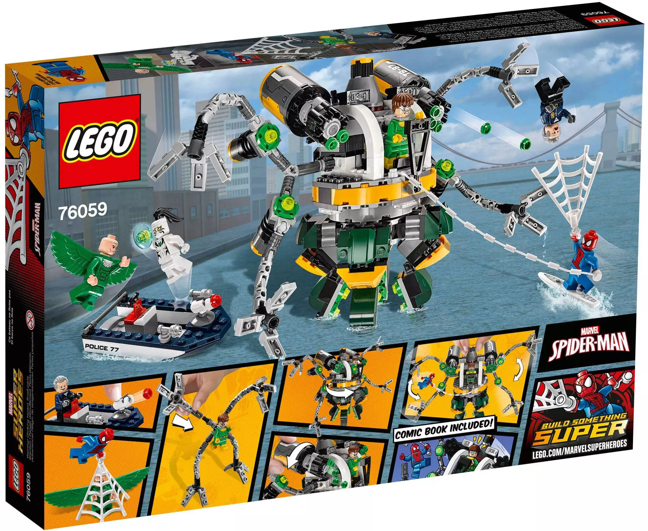 Конструктор LEGO Super Heroes 76059 Человек-паук: В ловушке Доктора Осьминог – это захватывающий набор, который погружает вас в мир Человека-паука и его борьбы с одним из самых известных злодеев, Доктором Осьминогом. Этот набор позволит вам воссоздать эпические сражения и захватывающие приключения любимого супергероя.