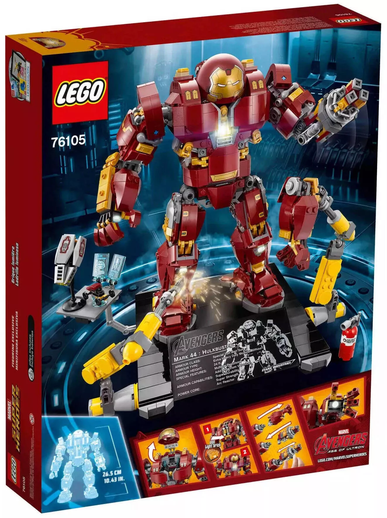 LEGO Super Heroes 76105 Халкбастер: эра Альтрона – это впечатляющий набор для фанатов вселенной Marvel, который позволяет собрать огромную и детализированную модель Халкбастера, легендарного боевого костюма, созданного для борьбы с Халком. Этот набор идеально подойдет для коллекционеров и поклонников супергеройских фильмов, желающих воспроизвести культовые сцены из «Мстителей: Эра Альтрона».
