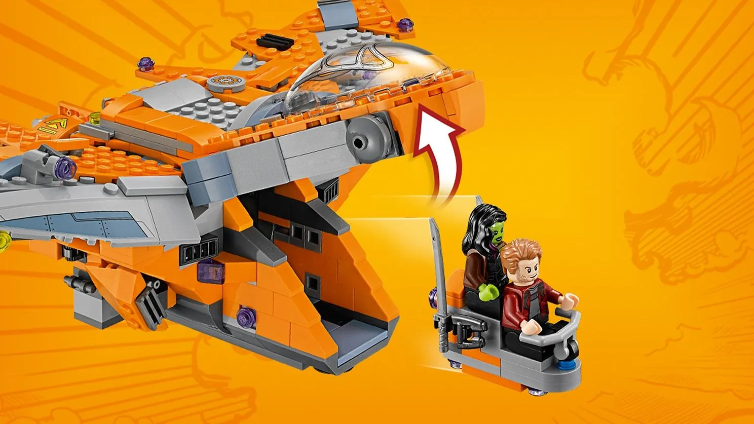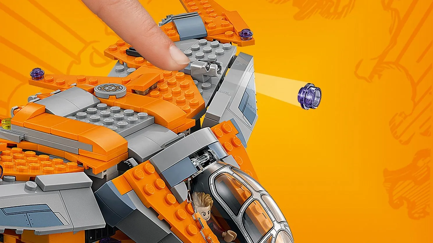 Погрузитесь в космическое приключение с набором LEGO, включающим корабль Стражей Галактики, космический скутер, стенд с Перчаткой Бесконечности и 4 минифигурки.