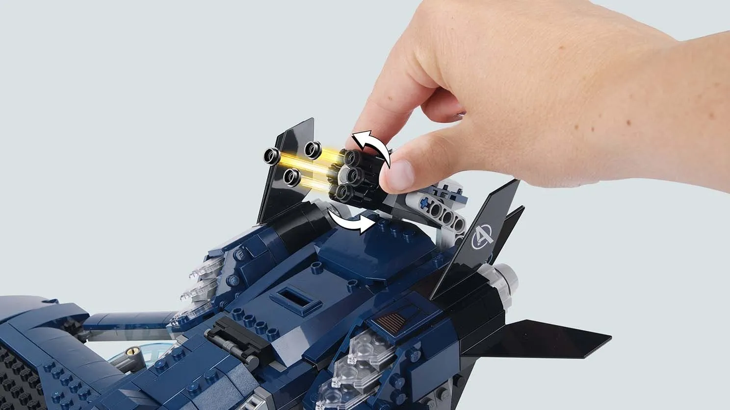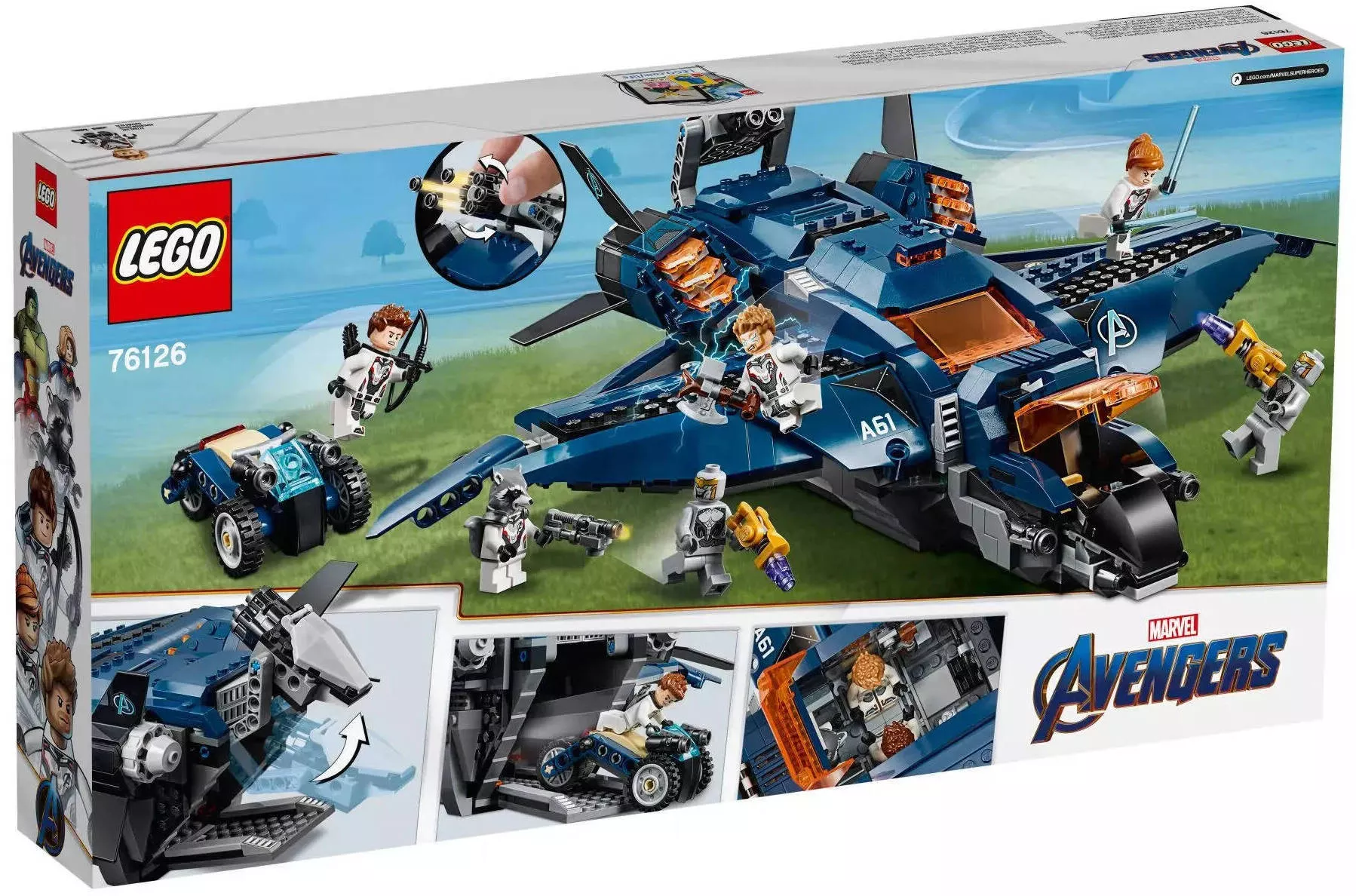 Этот набор включает в себя уникальный модернизированный квинджет Мстителей, оснащённый продуманным внутренним пространством без разделений между кабиной и грузовым отсеком. Модель предлагает три способа доступа и возможность размещения до 11 минифигурок внутри. Внешний вид дополняется гладкой обшивкой и эмблемой Мстителей.