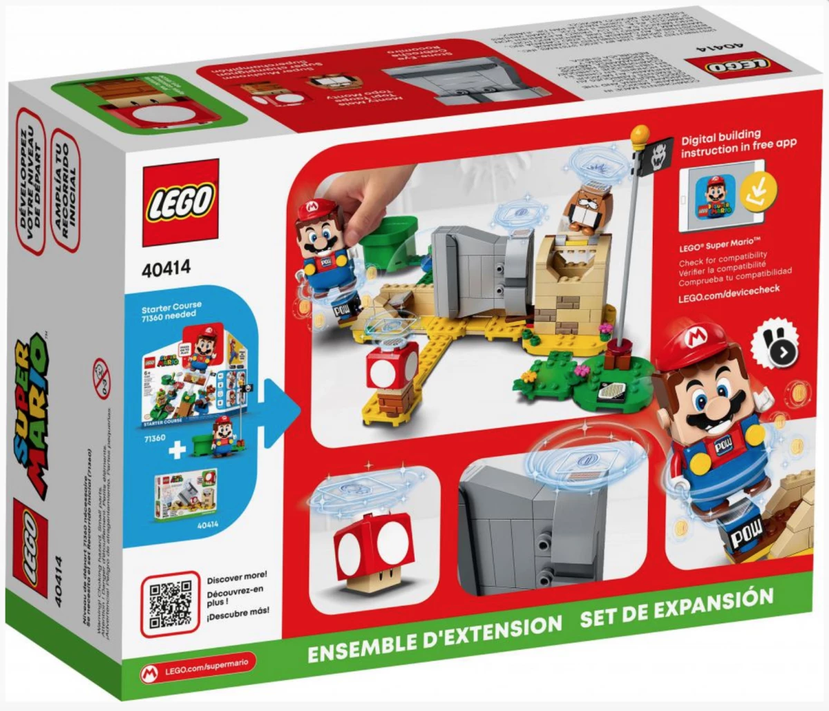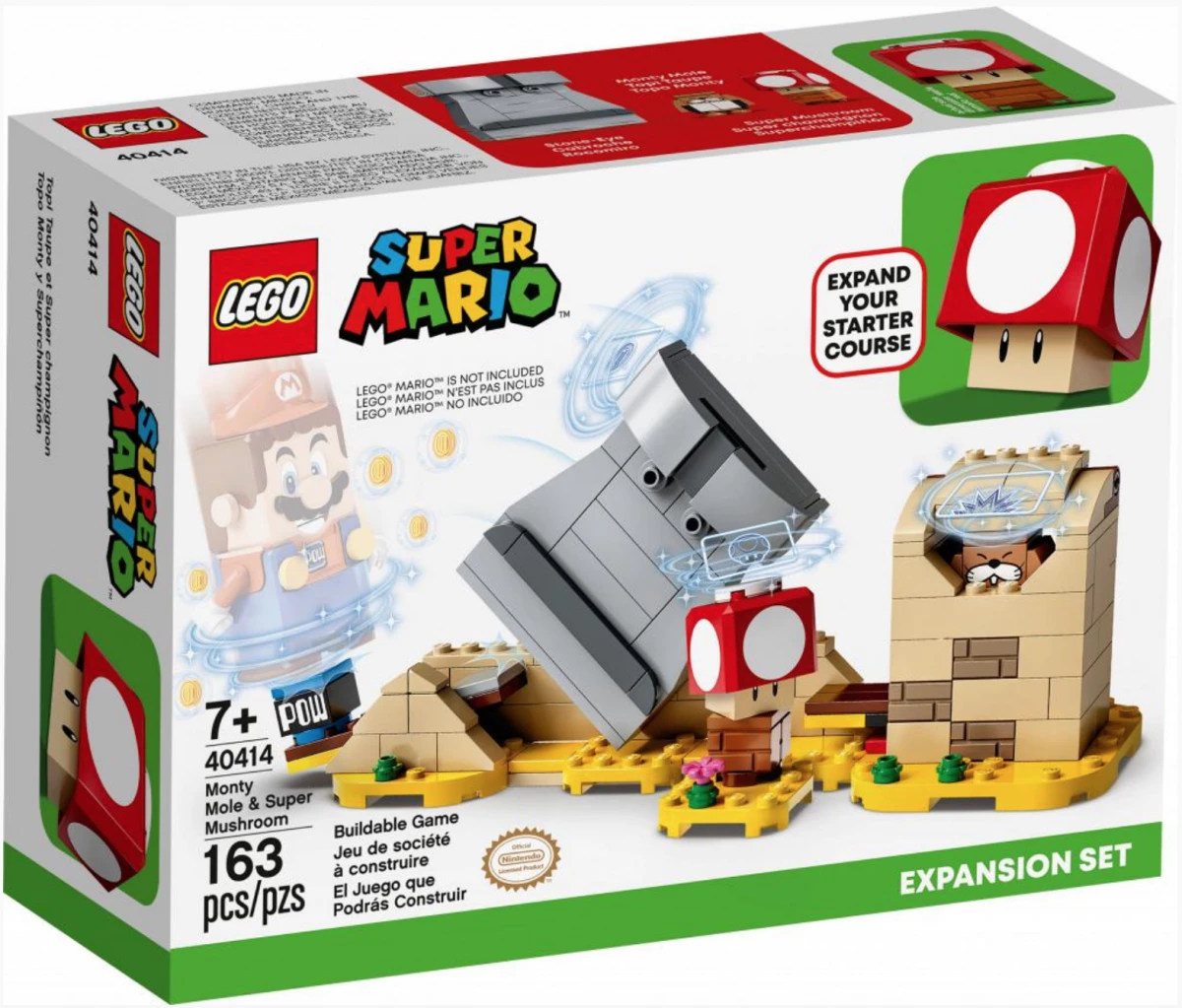 LEGO Super Mario 40414 Монти и Супергриб состоит из 163 деталей и предоставляет возможность построить забавные сцены с участием Монти и Супергриба. Набор включает в себя всё необходимое для создания увлекательных игровых ситуаций и взаимодействий с фигуркой Марио.